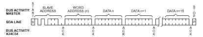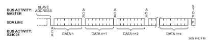 3.2 寫操作 寫操作分為字節(jié)寫和頁面寫兩種操作,對于頁面寫根據(jù)芯片的一次裝載的字節(jié)不同有所不同。關(guān)于頁面寫的地址、應(yīng)答和數(shù)據(jù)傳送的時序參見圖3。 | |