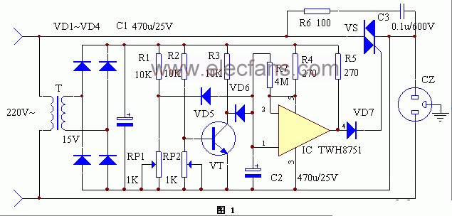 電路原理見圖1。當220V市電電網(wǎng)電壓過低時,可能損壞電冰箱電機時,R1和RP1分壓值減小,使VD5導通,使集成電路IC導通,接著使VD7截止,隨之雙向可控硅VS關斷,從而切斷電冰箱電源。調節(jié)RP1可設定欠壓保護值。