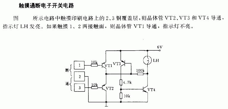 電路非常簡單,當(dāng)用手觸摸金屬片時,VT1導(dǎo)通,給電容C2充電,電容通過R3放電,使VT4導(dǎo)通,點(diǎn)燈被點(diǎn)亮,當(dāng)電容C2中的電荷放