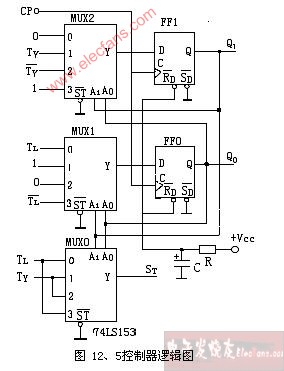 ????根據(jù)以上方程,選用數(shù)據(jù)選擇器 74LS153來實現(xiàn)每個D觸發(fā)器的輸入函數(shù),將觸發(fā)器的現(xiàn)態(tài)值( )加到74LS153的數(shù)據(jù)選擇輸入端作為控制信號.即可實現(xiàn)控制器的功能??刂破鞯倪壿媹D如圖12、5所示。圖中R、C構(gòu)成上電復(fù)位電路 。