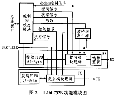 TL16C752B內(nèi)含雙UART,并自帶64字節(jié)收發(fā)FIFO,可自動進(jìn)行軟件流和硬件流控制,最大波特率可達(dá)3Mbps。此外,TL16C752B還提供了其它一些增強(qiáng)功能,可通過設(shè)定EFR寄存器的相關(guān)位來實(shí)現(xiàn)。通過FIFO RDY 寄存器可讀?。裕兀遥模伲遥兀遥模僖_的狀態(tài);而通過片內(nèi)寄存器則可為使用者提供接收數(shù)據(jù)的錯(cuò)誤識別、操作狀態(tài)以及MODEM的接口控制信號。