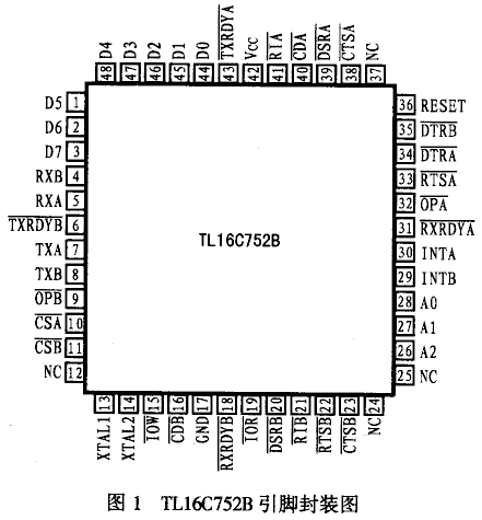 TL16C752B的引腳排列如圖1所示,各主要引腳的功能如下: