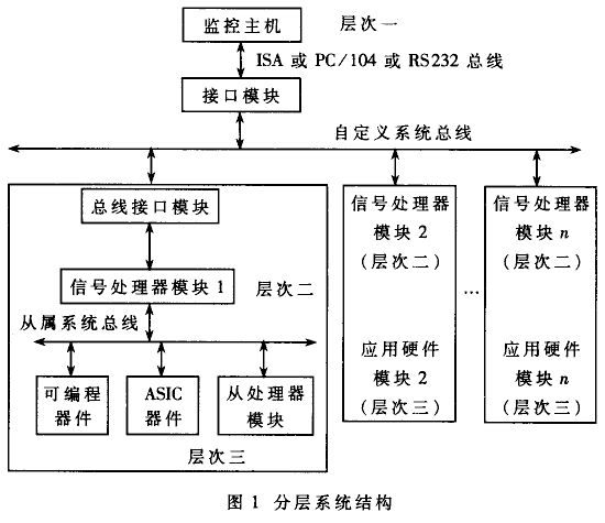 根據(jù)以上思路,系統(tǒng)宜采用分層式結(jié)構(gòu),如圖1所示。其中,自定義系統(tǒng)總線(類似于GPIB總線)及接口模塊實(shí)現(xiàn)主機(jī)(層次一)對多個(gè)信號處理模塊(層次二、三)的監(jiān)控,基于16位ISA并行接口的設(shè)計(jì)細(xì)節(jié)參見參考文獻(xiàn)[2]。對于監(jiān)控主機(jī),在通過了調(diào)試階段后,可以用單片機(jī)替代之以進(jìn)一步減小體積重量,降低成本。在信號處理器模塊中,DSP芯片及其RAM與EPROM組成的最小系統(tǒng)構(gòu)成第二層次,其硬件/軟件都具有通用性。真正與具體產(chǎn)品特定功能有關(guān)的是第三層次,它是由CPLD、ASIC芯片或級聯(lián)工作的從處理器構(gòu)成的應(yīng)用硬件模塊。隨著軟件無線電技術(shù)與器件的發(fā)展,非通用性功能越來越趨向.于用軟件實(shí)現(xiàn),而應(yīng)用硬件模塊則主要是高速CPLD、偏速模/數(shù)轉(zhuǎn)換器及數(shù)/模轉(zhuǎn)換器。因此第三層次也具有一定的通用性。