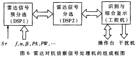 雷達(dá)對抗偵察的任務(wù)是偵收并分析敵方雷達(dá)信號,為干擾或火力摧毀敵方雷達(dá)提供情報(bào)。為此研制了基于多CPU級聯(lián)工作的信號處理分機(jī),如圖6所示。它包括:雷達(dá)信號預(yù)分選模塊、分選處理模塊、識別與綜合顯示模塊。在預(yù)分選模塊中,由第一個(gè)DSP對來自參數(shù)測量分機(jī)的高速雷達(dá)視頻脈沖串進(jìn)行稀釋與粗略分類(按頻率分),并把脈沖描述字(包括頻率f、方位、脈幅PA、脈寬PW、到達(dá)時(shí)間TOA等)通過雙口RAM傳遞給第二個(gè)DSP進(jìn)行分選處理,以分離各部雷達(dá)的脈沖信號,從而測得各自技術(shù)參數(shù)。工控機(jī)獲得測量參數(shù)后與雷達(dá)情報(bào)數(shù)據(jù)庫比對,以識別敵方雷達(dá)類型、用途與威脅等級,為指揮決策提供依據(jù)。按處理速度、傳輸速度、存儲容量優(yōu)化配置流水線上各級CPU的任務(wù),可使整個(gè)系統(tǒng)達(dá)到最大處理能力。試驗(yàn)表明其速度已符合實(shí)戰(zhàn)要求。