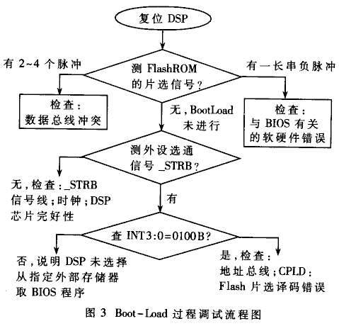 · 把DSP-BIOS軟件燒寫入Flash-ROM,調(diào)試確認(rèn)DSP的Boot-Load過程。若BIOS程序未正常運(yùn)行,可按流程圖3來調(diào)試。
