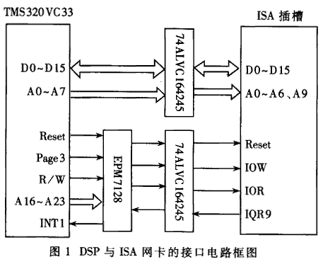 74ALVC16425是總線驅(qū)動芯片,可實(shí)現(xiàn)3.3V到5V的電平轉(zhuǎn)換。由于TMS320VC33和EPM7128是3.3V的器件,而ISA總線是5V的,所以信號線不能直接連接,需要通過74ALVC164245進(jìn)行電平轉(zhuǎn)換和隔離。
