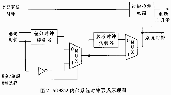 為了實(shí)現(xiàn)三片AD9852輸出信號(hào)波形相位同步,必須保證所有的AD9852芯片在同一個(gè)系統(tǒng)時(shí)鐘節(jié)拍下工作,每個(gè)AD9852的系統(tǒng)時(shí)鐘之間的相位誤差應(yīng)該最大不超過一個(gè)周期。AD9852內(nèi)部系統(tǒng)時(shí)鐘形成原理圖如圖2所示。AD9852有關(guān)分或單端兩種參考時(shí)鐘形式,它們既可以直接形成系統(tǒng)時(shí)鐘,又可以通過參考時(shí)鐘倍頻器倍頻后形成系統(tǒng)時(shí)鐘,選擇哪種參考時(shí)鐘和是否通過參考時(shí)鐘倍頻器倍頻可由用戶根據(jù)需要自行設(shè)置;異步的外部更新時(shí)鐘經(jīng)過邊沿檢測電路后與系統(tǒng)時(shí)鐘同步,形成上升沿,觸內(nèi)部控制寄存器更新內(nèi)容。從上述分析中可以看出,只有三處AD9852芯片參考時(shí)鐘同步,才能避免它們系統(tǒng)時(shí)鐘彼此之間不同步。下面介紹影響三片AD9852芯片同步工作的幾個(gè)關(guān)鍵信號(hào)。