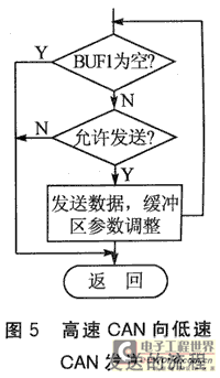 數(shù)據(jù)的發(fā)送由發(fā)送子程序完成,網(wǎng)關(guān)中主要有3個發(fā)送子程序,分別對應(yīng)兩路CAN控制器以及一路 LIN發(fā)送器。高速CAN的發(fā)送子程序負(fù)責(zé)發(fā)送BUF1中的數(shù)據(jù),LIN的發(fā)送子程序負(fù)責(zé)發(fā)送BUF3中的數(shù)據(jù),低速CAN的發(fā)送子程序負(fù)責(zé)發(fā)送BUF2 和BUF4中的數(shù)據(jù)。數(shù)據(jù)的發(fā)送采用查詢總線狀態(tài)的發(fā)送方式:查詢總線的忙閑情況,如果總線忙,則退出發(fā)送子程序,進(jìn)行其他的工作;如果總線空閑,則發(fā)送數(shù)據(jù)。發(fā)送完1幀數(shù)據(jù)后,再檢查與之相應(yīng)的緩沖區(qū)的狀態(tài)。如果為空,則退出發(fā)送子程序;如果非空,則再檢查總線的忙閑狀態(tài)。如果忙,則退出發(fā)送子程序;如果空閑,則發(fā)送數(shù)據(jù)。然后再開始新一輪的數(shù)據(jù)查詢發(fā)送過程。圖5為高速CAN向低速CAN發(fā)送的流程,其他的發(fā)送子程序過程與此類似。