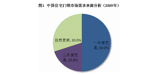 住宅門鎖的需求主要來源于三個方面:一手房交易、二手房交易和現(xiàn)有門鎖由于使用壽命等原因的自然更新。2009年,將近50%的市場交易額來源于一手房交易所帶動的需求。