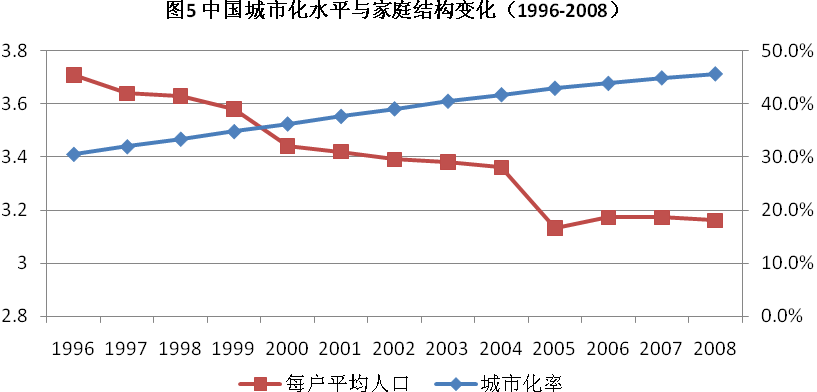 目前中國城鎮(zhèn)家庭結(jié)構(gòu)日趨小型化,戶均人口數(shù)量從1996年的3.7人,降低到了2008年的3.2人。而城市化水平大幅度提高,使城市人口增加。兩方面的變化共同刺激了房地產(chǎn)市場的高速增長。