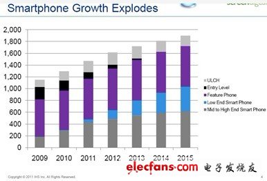 與此同時(shí),iSuppli的數(shù)據(jù)也基本與之差不多,下圖顯示從2011年開(kāi)始低端智手機(jī)的數(shù)量開(kāi)始穩(wěn)步上升。