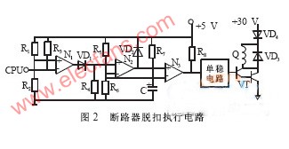 智能化斷路器的執(zhí)行元件為一個(gè)帶永久磁鐵的磁通變換器, 其特點(diǎn)是體積小, 功耗低, 脫扣力大。正常工作時(shí)永久磁鐵使動(dòng)靜鐵芯保持吸合。來(lái)自互感器的過(guò)載、短路、接地等故障信號(hào), 按預(yù)先設(shè)計(jì)好的保護(hù)特性要求, 經(jīng)微處理器單元處理后, 發(fā)出一定寬度的跳閘脈沖(負(fù)方波脈沖)送到磁通變換器的線(xiàn)圈,產(chǎn)生反向磁場(chǎng), 抵消永久磁通, 動(dòng)鐵芯釋放產(chǎn)生的機(jī)械能量推動(dòng)斷路器的脫扣器使斷路器分?jǐn)? 其脫扣執(zhí)行電路如圖2 所示