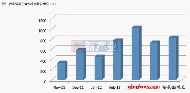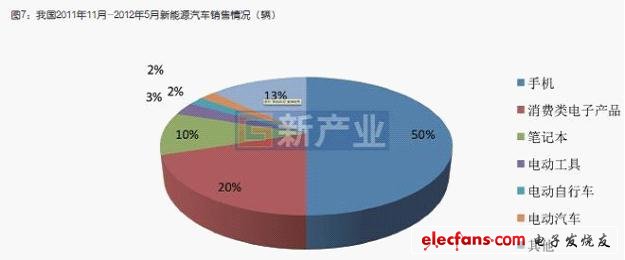 從2012年1-6月份下游需求情況看,我國鋰離子電池仍然是以手機(jī)電池、消費(fèi)類電子產(chǎn)品電池、筆記本電腦電池為主,需求量占鋰離子電池總需求量80%;而曾經(jīng)被政府、投資者、科研人員寄予厚望的新能源汽車需求量僅占2%,電動自行車占2%,電動工具占3%,礦燈、玩具等其他需求占13%(圖6)。