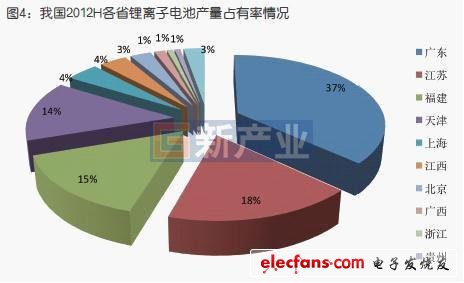 據(jù)統(tǒng)計(jì),2012年上半年廣東省完成6.56億只鋰離子電池產(chǎn)量,占37%;江蘇省3.16億只,占18%;福建省2.71億只,占15%;天津市2.5億只,占14%;上海市0.75億只,占4.23%,這五個省份位居我國鋰離子電池產(chǎn)量前五名(圖4)。