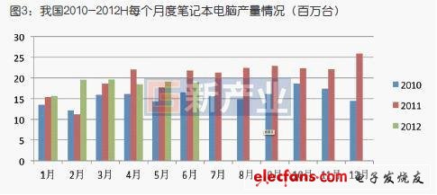 鋰離子電池傳統(tǒng)的兩大終端需求——筆記本電腦和移動通信手機(jī)產(chǎn)量增長平緩。上半年手機(jī)產(chǎn)量為5.27億部,同比增長5.17%(圖2);筆記本電腦產(chǎn)量為1.11億臺,同比增長4.3%(圖3)。