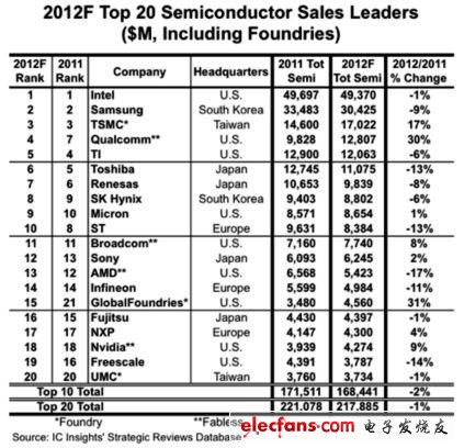 2012年ICInsights全球前二十大晶片供應(yīng)商排行榜(包含晶圓代工業(yè)者,以營收計(jì))