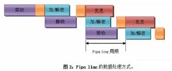 產(chǎn)品的速度要比沒(méi)有加密功能的產(chǎn)品降低很多。為再次提高加密傳輸速度,在數(shù)據(jù)加密傳輸的過(guò)程中采用了Pipe line(流水線(xiàn))的數(shù)據(jù)處理方式,可使處理速度再提高兩倍。 處理一個(gè)數(shù)據(jù)包時(shí)將整個(gè)過(guò)程分解為3個(gè)部分:接收、加/解密、發(fā)送。CPU在每完成一步時(shí)