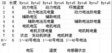 監(jiān)控節(jié)點(diǎn)發(fā)送信息的報(bào)文標(biāo)識(shí)符為00H,用于向數(shù)據(jù)采集節(jié)點(diǎn)發(fā)送查詢信息,采集節(jié)點(diǎn)收到監(jiān)控節(jié)點(diǎn)的查詢信息后,向總線上發(fā)送自己的一包數(shù)據(jù),監(jiān)控節(jié)點(diǎn)收到以后確認(rèn)此節(jié)點(diǎn)工作正常。通過(guò)這種方式,監(jiān)控節(jié)點(diǎn)可以隨時(shí)查詢網(wǎng)絡(luò)中連接了那些數(shù)據(jù)采集節(jié)點(diǎn)。由于報(bào)文所帶數(shù)據(jù)長(zhǎng)度最大為8字節(jié),對(duì)于測(cè)量參數(shù)較多的電量節(jié)點(diǎn)和電池節(jié)點(diǎn),需要分配較多的報(bào)文標(biāo)識(shí)符。每個(gè)電量節(jié)點(diǎn)分配2個(gè)標(biāo)識(shí)符,每節(jié)電池分配1個(gè)標(biāo)識(shí)符。因?yàn)榕c參數(shù)相聯(lián)系的報(bào)文標(biāo)識(shí)符是固定的,根據(jù)收到的標(biāo)識(shí)符就可判斷收到的是哪個(gè)參數(shù)。電動(dòng)汽車整車參數(shù)監(jiān)測(cè)網(wǎng)絡(luò)中傳送的報(bào)文標(biāo)識(shí)符(ID)與參數(shù)的對(duì)應(yīng)關(guān)系見表1: