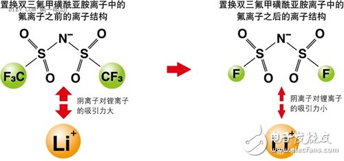日本關(guān)西大學(xué)的石川正司教授在研究用來作為鋰離子蓄電池電解液的某種離子液體時,發(fā)現(xiàn)陰離子對鋰離子的吸引力非常大,以至于在離子液體中鋰離子幾乎無法移動。其結(jié)果,使用離子液體的鋰離子蓄電池完全無法發(fā)其功能。在這種情況下,石川教授將陰離子中原有的3個氟原子減少為1個,大大降低了陰離子對鋰離子的束縛力,成功地開發(fā)出了新型的鋰離子蓄電池。