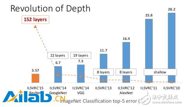 自從Alex和他的導(dǎo)師Hinton(深度學(xué)習(xí)鼻祖)在2012年的ImageNet大規(guī)模圖像識(shí)別競(jìng)賽(ILSVRC2012)中以超過第二名10個(gè)百分點(diǎn)的成績(83.6%的Top5精度)碾壓第二名(74.2%,使用傳統(tǒng)的計(jì)算機(jī)視覺方法)后,深度學(xué)習(xí)真正開始火熱,卷積神經(jīng)網(wǎng)絡(luò)(CNN)開始成為家喻戶曉的名字,從12年的AlexNet(83.6%),到2013年ImageNet大規(guī)模圖像識(shí)別競(jìng)賽冠軍的88.8%,再到2014年VGG的92.7%和同年的GoogLeNet的93.3%,終于,到了2015年,在1000類的圖像識(shí)別中,微軟提出的殘差網(wǎng)(ResNet)以96.43%的Top5正確率,達(dá)到了超過人類的水平(人類的正確率也只有94.9%)。