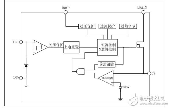 系統(tǒng)上電后,母線(xiàn)電壓通過(guò)啟動(dòng)電阻對(duì) VCC 電容充電,當(dāng) VCC 電壓達(dá)到芯片開(kāi)啟閾值時(shí),芯片內(nèi)部控制電路開(kāi)始工作。 LNK6932P內(nèi)置 17V 穩(wěn)壓管,用于鉗位 VCC 電壓。芯片正常工作時(shí),需要的 VCC 電流極低,所以無(wú)需輔助繞組供電