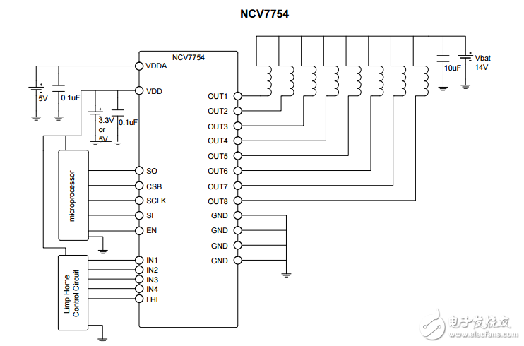 The NCV7754 is an automotive eight channel low?side driver providing drive capability up to 500 mA per channel. Output control is via a SPI port and offers convenient reporting of faults for open load (or short to ground), over load, and over temperature conditions. Additionally, parallel control of the outputs is addressable (in pairs) via the INx pins. A dedicated limp?home mode pin (LHI) enables OUT1?OUT4 while disabling OUT5?OUT8. Each output driver is protected for over load current and includes an output clamp for inductive loads. The NCV7754 is available in a SSOP?24 fused lead package.