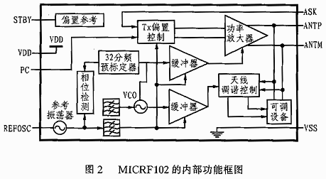 圖2為MOCRF102的內(nèi)部功能原理框圖,它主要包括UHF合成器、緩沖器、天線調(diào)諧器、功率放大器、TX偏置控制、偏置參考以及調(diào)節(jié)電路等。