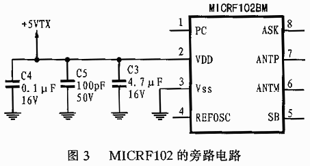 由諧振器和一個(gè)電阻組成的PCB(印刷電路板)天線環(huán)路分配網(wǎng)絡(luò)是遠(yuǎn)程操作(如自動(dòng)無(wú)鍵登錄)所需的UHF發(fā)射器部件。另外,MICRF102中還有一個(gè)差分變?nèi)萜?該變?nèi)萜骺捎脕?lái)保證發(fā)射頻率和接收頻率在過(guò)壓或溫度變化時(shí)相匹配。