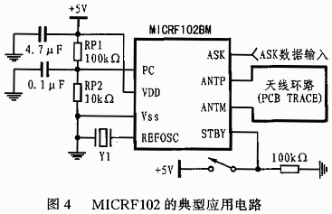 圖4為MICRF102的典型應(yīng)用電路??梢钥闯?該電路所需的外圍元件僅有幾個(gè)電容、電阻和天線環(huán)路。因此,MICRF102的設(shè)計(jì)非常簡(jiǎn)單,而且可靠性高。從寬帶的超再生發(fā)報(bào)器到窄帶的高性能、超外差式接收機(jī)等多種系統(tǒng),MICRF102均可與它們中所有的ASK/OOK UHF接收器相兼容,其頻率范圍為300MHz~47MHz,數(shù)據(jù)傳輸速率可達(dá)20kpbs。若將MICRF102發(fā)射器與Micrel系列的天線接收芯片MICRF001/002/022/003/004/007配合使用,可實(shí)現(xiàn)完整的無(wú)線數(shù)據(jù)發(fā)射的接收功能,同時(shí)可大大減少設(shè)計(jì)和生產(chǎn)成本。