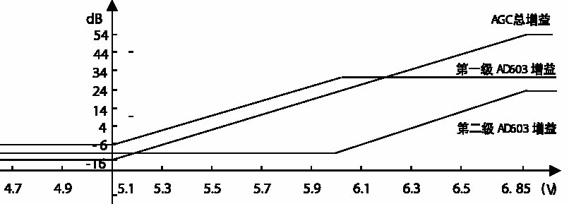 根據(jù)實(shí)際設(shè)計(jì)應(yīng)留有一定的余量。將第一片AD603的增益范圍定為?????? -6~30dB,則相應(yīng)的V12為-400~500mV,而其2腳已固定在5.5V,故1腳的控制電壓即VAGC應(yīng)為5.1~6V。第二片AD603的增益范圍定為-10~24dB,則相應(yīng)的V12為-500~350mV,而其2腳已固定在6.5V,故1腳的控制電壓即VAGC應(yīng)為6~6.85V,兩片順序級(jí)聯(lián)后的總增益范圍為-16~54dB,如圖3所示。