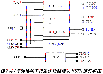 由于FPGA是通過DSP處理機的外部總線獲得數(shù)據(jù)的,其數(shù)據(jù)形式是并行的,所以發(fā)送前應將其轉(zhuǎn)換為串行比特流。FPGA內(nèi)實現(xiàn)并/串轉(zhuǎn)換和串行發(fā)送功能的模塊HSTX的原理框圖如圖2所示。