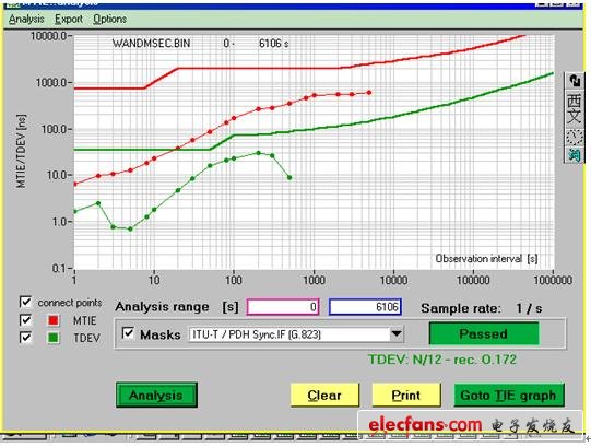 (時(shí)間偏差)來評(píng)估的。 我們通過專用的TestManagerPro數(shù)據(jù)分析軟件,可對(duì)測試記錄進(jìn)行專業(yè)的數(shù)據(jù)分析及模板比對(duì),統(tǒng)計(jì)分析時(shí)鐘同步信號(hào)的長期漂移性能,可計(jì)算MTIE、TDEV,并按照G.811、G.812、G.813、G.823、G.8261等模板進(jìn)行比對(duì),并生成測試報(bào)表。`