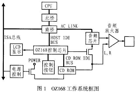 OZ168是O2 MICRO公司生產(chǎn)的專用便攜式電腦音頻播放芯片。目前,便攜式電腦幾乎都將CD/DVD ROM作為標(biāo)準(zhǔn)配置,正常情況下,在便攜式電腦上播放CD音樂都需要先將系統(tǒng)開機,用Window-sTMMedia Player或其它媒體播放軟件來播放。為了簡單的功能去開啟系統(tǒng),而消耗大量的電池電力,這無疑會為正常的移動辦公帶來電池電力不足的壓力。AudjoDJTM技術(shù)能使便攜式電腦用戶在隨時欣賞CD音樂的美妙的同時,無需顧慮電池的容量限制,OZ168器件的專用隔電措施可保證只提供CD/DVD ROM等少部分系統(tǒng)工作電源而將電腦其它部分關(guān)閉,從而大大降低電腦的電池消耗,最大限度地延長電池工作時間。圖1是OZ168的工作系統(tǒng)框圖,它的主要功能和特點如下: