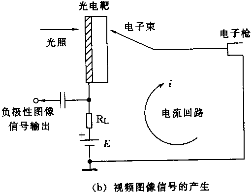 (3)圖像信號的產(chǎn)生:圖像信號產(chǎn)生電路示意圖如圖07-02-11(b)所示。當圖像通過攝像機鏡頭成像于光電靶時,對應(yīng)于圖像像素的亮點,光電導層的電導率高,等效電阻小,電子束掃射到圖07-02-10光電靶與視頻圖像信號產(chǎn)生此“亮點”時,它在回路中形成的電流大,在負載電阻上的壓降較大,輸出電壓較小。反之,對應(yīng)于圖像像素的暗點,光電導層相應(yīng)的等效電阻大,電子束掃射到“暗點”時,它在回路中形成的電流小,在負載電阻上的壓降較小,輸出電壓較大。顯然,攝像管輸出的圖像信號電壓的高低與圖像的亮暗成反比,稱為負極性電視信號。順便指出,若圖像信號電壓的高低與圖像的亮暗成正比,稱之為正極性電視信號。由上所述,攝像管將圖像各點像素的亮暗信息轉(zhuǎn)換為電壓隨之變化的電信號,完成了光電轉(zhuǎn)換。