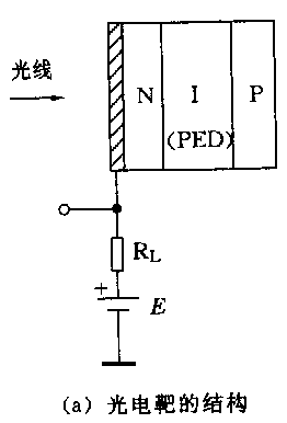 (1)光電靶;在攝像管前方玻璃屏內(nèi)壁上鍍上一層很薄且透明的金屬導電膜,作為光的通路和信號輸出電極,金屬膜的后面是光電靶,其結(jié)構(gòu)如圖07-02-11(a)所示。光電靶由三層半導體材料組成。中間較厚的一層為氧化鉛半導體(pbo),稱為I層,里面受電子束掃描的一層為P型半導體層,在外面受光照射并與透明金屬膜接觸的一層為N型半導體。P層與N層都比I層薄得多,因此pbo管的光電靶實際上相當于一個光敏二極管,主要由I層(pbo)決定其工作性能。由于半導體的光敏特性,當照射在它上面的光線強弱變化時,其等效電阻也隨之變化。