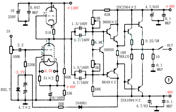 末級(jí)用兩對(duì)東芝Hi—Fi對(duì)管2SC2564/2SAl094作并聯(lián)輸出。該管fT=90MHz,是常見的2SC3280/2SAl301特征頻率的三倍,電流12A.功率120W。推動(dòng)級(jí)則選用日立發(fā)燒對(duì)管25D669/2SB649,該管fT高達(dá)140MHz,耗散功率20W,用它與2SC2564/2SAl094搭檔能輸出相當(dāng)溫暖甜潤的音色。