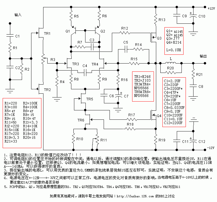 由TR1(K246)、TR2(J103)組成的緩沖電路:用來(lái)隔離前后級(jí)之間的信號(hào)干擾,提高聲音的清晰度,這個(gè)電路是甲類互補(bǔ)源極輸出器,輸入阻抗很高,而輸出阻抗很小,日本的發(fā)燒友很多電路中都有應(yīng)用。調(diào)節(jié)R3可以使電路的輸出中點(diǎn)保持在0V左右。