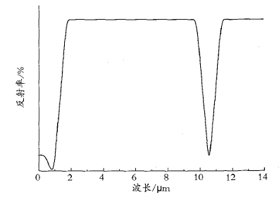 理想狀態(tài)的激光/紅外隱身涂層應(yīng)在1.06μm和10.6μm具有極低的反射率,而在其他紅外波段則具有盡可能高的反射率,如圖1所示。然而這種材料實(shí)際上很難獲取。近來(lái),摻雜半導(dǎo)體成為激光隱身涂料的研究熱點(diǎn),摻雜半導(dǎo)體可作為涂料體系中的非著色顏料,經(jīng)過(guò)適當(dāng)選配半導(dǎo)體載流子參數(shù)可使涂料的紅外和激光隱身性能都達(dá)到令人滿意的結(jié)果,同時(shí)也不會(huì)防礙涂層滿足可見光偽裝的要求。摻雜半導(dǎo)體一般選用InO3或者In2O3和SnO2。通過(guò)摻雜使得等離子波長(zhǎng)處于合適的范圍,使材料在1.06μm處具有強(qiáng)吸收低反射,在熱紅外波段具有低吸收高反射,從而達(dá)到兩者隱身兼容。