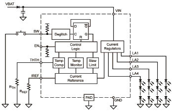 對于汽車應(yīng)用,在以每串高達(dá)100mA的總電流驅(qū)動4串(每串1~3個LED)時,可以實現(xiàn)最佳性能。輸出可以并行連接,或者按要求閑置。