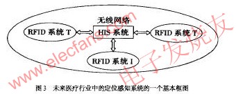 由定位感知系統(tǒng)的結(jié)構(gòu)特點和現(xiàn)有的醫(yī)療行業(yè)信息化水平來看,從現(xiàn)今的IT技術(shù)手段出發(fā),我們可以構(gòu)建未來醫(yī)療行業(yè)中的定位感知系統(tǒng)的一個基本框架(圖3):以無線網(wǎng)絡(luò)為通信環(huán)境,以不斷升級的HIS系統(tǒng)為系統(tǒng)控制中心,以RFID技術(shù)為主要定位技術(shù)和信息獲取技術(shù)。