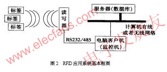 無線射頻識別技術(shù)(RFID, Radio Frequency Identification)是一種非接觸的自動識別技術(shù),其基本原理是利用空間電磁波的耦合或傳播來進(jìn)行通信,以達(dá)到自動識別被標(biāo)識對象,獲取標(biāo)識對象相關(guān)信息的目的。最簡單的RFID系統(tǒng)由標(biāo)簽(Tag)、讀寫器(Reader)和天線(Antenna)3部分組成,配合計算機(jī)網(wǎng)絡(luò)和軟件支持可以組成一個RFID應(yīng)用系統(tǒng)(圖2)。RFID運用無線電技術(shù)進(jìn)行通訊,信息儲存在標(biāo)簽中的一個小硅片中。標(biāo)簽進(jìn)入磁場后,接收解讀器發(fā)出的射頻信號,憑借感應(yīng)電流所獲得的能量發(fā)送出存儲在芯片中的信息(Passive Tag,無源標(biāo)簽或被動標(biāo)簽),或者主動發(fā)送某一頻率的加密信號(Active Tag,有源標(biāo)簽或主動標(biāo)簽);解讀器讀取信息并解碼后送至中央信息系統(tǒng)進(jìn)行有關(guān)數(shù)據(jù)處理。