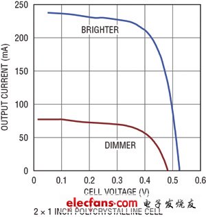 為了從光伏電池抽取最大功率,電源轉(zhuǎn)換器的輸入阻抗必須與電池的輸出阻抗匹配,從而使系統(tǒng)能在最大功率點(diǎn)上工作。圖3顯示了一個(gè)典型的單節(jié)光伏電池的功率曲線。為了確保抽取最大功率,光伏電池的輸出電壓應(yīng)該與功率曲線的峰值點(diǎn)相對(duì)應(yīng)。LTC3105 調(diào)節(jié)提供給負(fù)載的輸出電流,以保持光伏電池的電壓等于最大功率點(diǎn)控制引腳設(shè)定的電壓。因此可用單個(gè)電阻器設(shè)定最大功率點(diǎn),并確保從光伏電池抽取最大功率和峰值輸出充電電流。