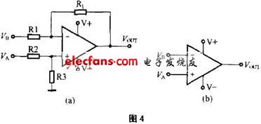 圖4(a)由運算放大器組成的差分放大器電路,輸入電壓VA經(jīng)分壓器R2、R3分壓后接在同相端,VB通過輸入電阻R1接在反相端,RF為反饋電阻,若不考慮輸入失調(diào)電壓,則其輸出電壓Vout與VA、VB及4個電阻的關(guān)系式為:Vout=(1+RF/R1)·R3/(R2+R3)VA-(RF/R1)VB。若R1=R2,R3=RF,則Vout=RF/R1(VA-VB),RF/R1為放大器的增益。當(dāng)R1=R2=0(相當(dāng)于R1、R2短路),R3=RF=∞(相當(dāng)于R3、RF開路)時,Vout=∞。增益成為無窮大,其電路圖就形成圖4(b)的樣子,差分放大器處于開環(huán)狀態(tài),它就是比較器電路。實際上,運放處于開環(huán)狀態(tài)時,其增益并非無窮大,而Vout輸出是飽和電壓,它小于正負(fù)電源電壓,也不可能是無窮大。