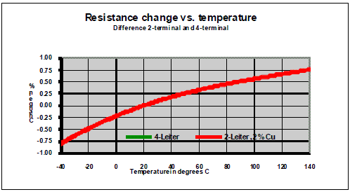 盡管端子和引線的冗余電阻可以通過補(bǔ)償校準(zhǔn)來消除,但它對總電阻的溫度系數(shù)有著極大的影響。(如下圖所示)