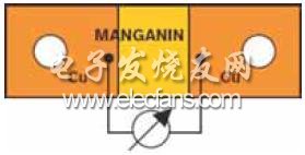 四引線設(shè)計(jì)推薦用于大電流和低阻值應(yīng)用。通常的做法使用錳鎳銅合金帶直接沖壓成電阻器(圖7),但這不是最好的辦法。盡管四引線電阻有利于改進(jìn)溫度特性和熱電壓,但總阻值有時(shí)高出實(shí)際阻值2到3倍,這會導(dǎo)致難以接受的功率損耗和溫升。此外,電阻材料很難通過螺絲或焊接與銅連接,也會增加接觸電阻以及造成更大的損耗。