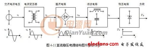 電路中,通常都需要電壓穩(wěn)定的直流電源供電。小功率穩(wěn)壓電源的組成可以用圖4-11表示,它是由電源變壓器、整流、濾波和穩(wěn)壓電路四部分組成。