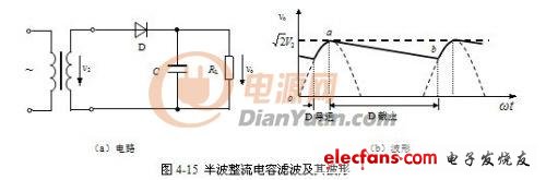 電容濾波電路是最簡(jiǎn)單的濾波器它是在整流電路的輸出端與負(fù)載并聯(lián)一個(gè)電容C而組成。如圖4-15(a)所示。