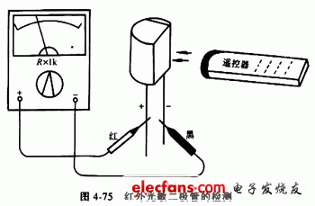 在測量紅外光敏二極管反向電阻值的同時(shí),用電視機(jī)遙控器對著被測紅外光敏二極管的接收窗口(見圖4-75)。正常的紅外光敏二極管,在按動(dòng)遙控器上按鍵時(shí),其反向電阻值會(huì)由500 kΩ以上減小至50~100 kΩ之間。阻值下降越多,說明紅外光敏二極管的靈敏度越高。