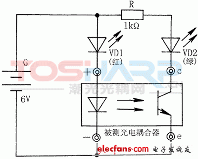 制作時,VD1用紅色閃爍發(fā)光二極管,VD2用綠色普通發(fā)光二極管。R用RTX-1/8W型碳膜電阻器。4個管腳插孔可用0.4mm~0.6mm的裸銅絲,在一枚2號大頭針上密繞十幾圈,并在尾端留出長度大于3cm的焊接引線(應(yīng)套上絕緣管),然后脫胎而成。G用4節(jié)5號干電池串聯(lián)(6V)而成,如用4F20-6V型疊層干電池會更方便。整個電路可焊裝在一個體積合適的塑料小盒內(nèi),面板開孔伸出兩個發(fā)光二極管的管帽和4個插孔。注意:輸入和輸出插孔的間距不要超過1cm,各插孔伸出的引線長度不要小于2cm,便于靈活互換位置,以適應(yīng)不同型號和引腳排列的光電耦合器檢測。本裝置不設(shè)電源開關(guān),用畢拔掉光電耦合器,電源即被自動切斷。