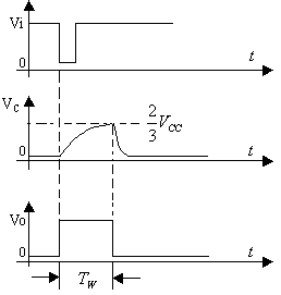 ,低電平比較器動作,單穩(wěn)態(tài)電路即開始一個穩(wěn)態(tài)過程,電容C開始充電,Vc按指數規(guī)律增長。當Vc充電到
